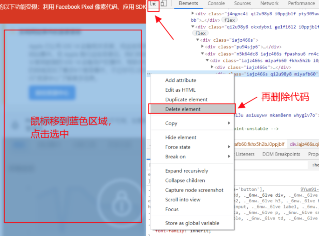 6. 重复上面的步骤,选中页面上的模糊部分,然后删除代码(注意:我们总是选中锁头附近的区域进行删除代码)